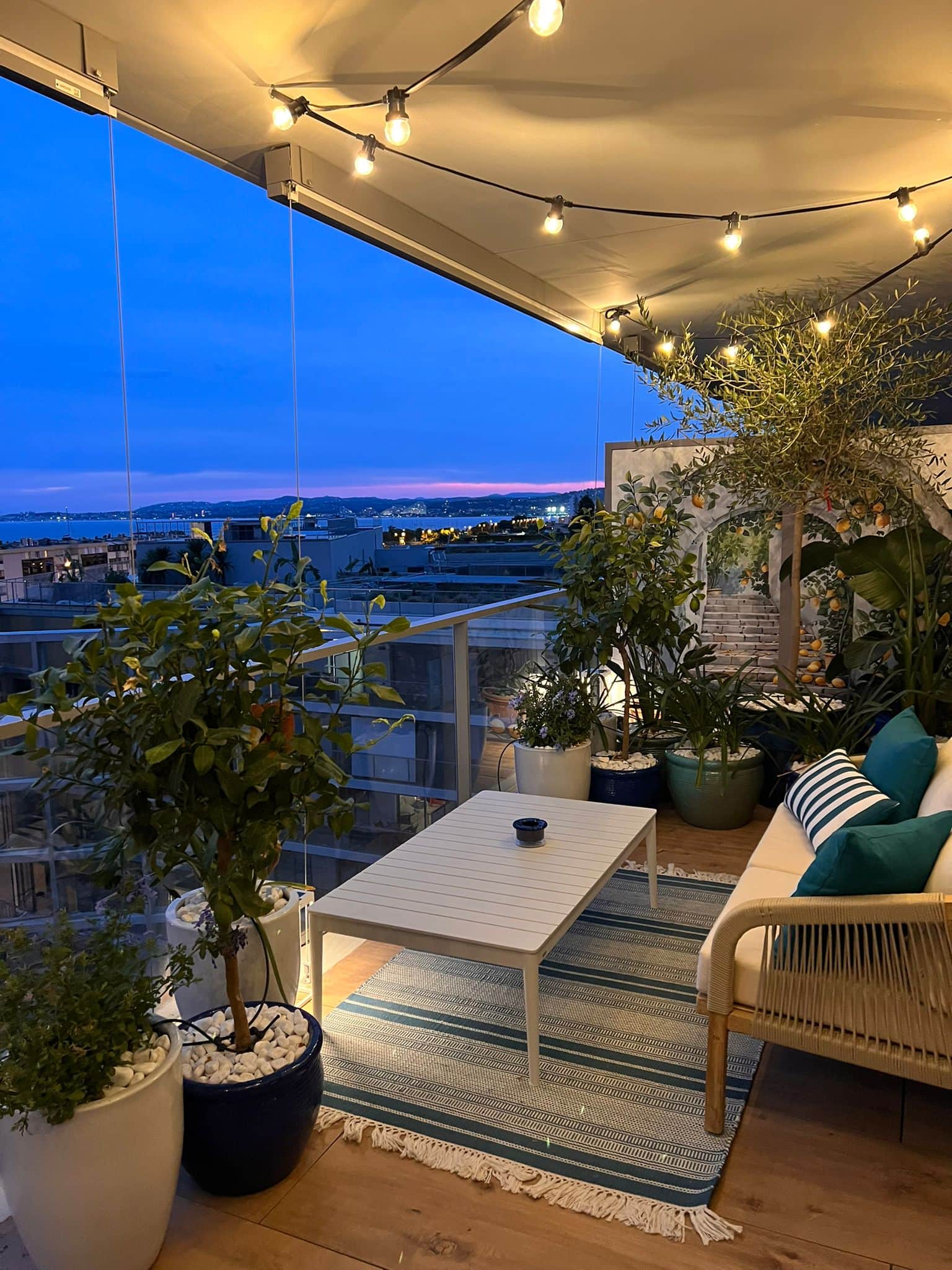 La terrasse, perchée au 6ᵉ étage, offre une superbe vue mer, sur la Baie des Anges. Elle est aménagée avec des plantes méditerranéennes et un mobilier extérieur très confortable, parfaite pour prendre le soleil, déjeuner en plein air ou profiter d’un apéritif au coucher du soleil.